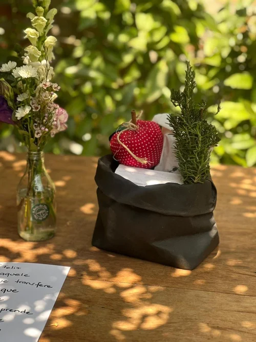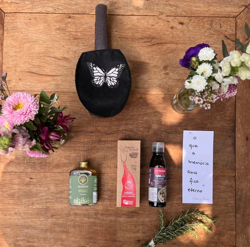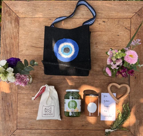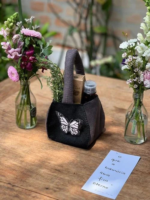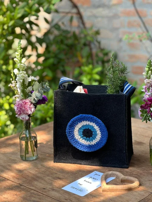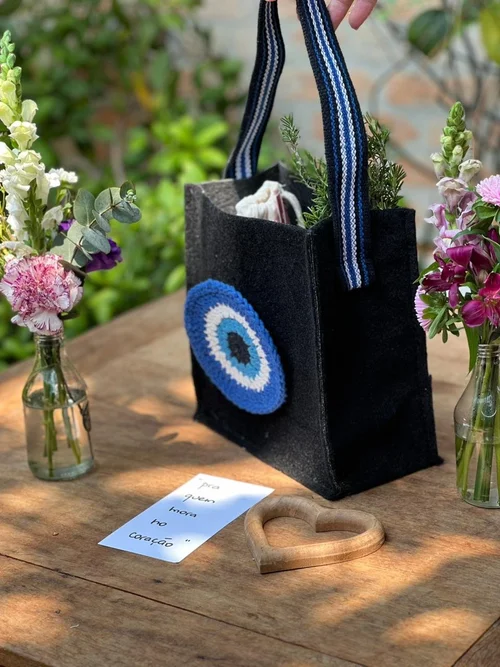 - Bolsa de Feltro - produzida pela nossa querida costureira há 8 anos, que começou sua jornada na costura ainda dentro do sistema prisional. Mãe solo e sempre dedicada, segue aprendendo e aperfeiçoando seu trabalho, criando peças feitas com cuidado e carinho. Decorada com olho grego e ramo de alecrim;